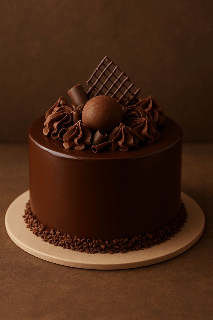 De buitenkant is strak afgewerkt met chocoladeroom, en met chocoladetoefjes op de bovenkant met verdere details. Het geheel straalt pure elegantie uit, donker en glanzend. Deze luxe chocoladetaart is perfect voor feestelijke gelegenheden, zoals een verjaardag of simpel voor na een diner.