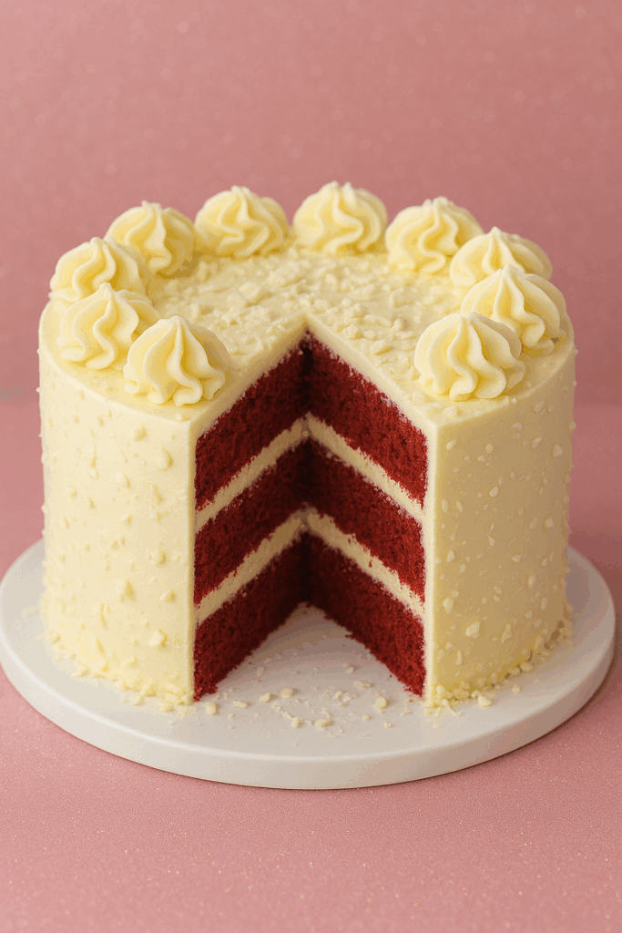 Een red velvet taart van drie lagen is een elegante, feestelijke taart met een mooie en opvallende uitstraling. De drie cakelagen hebben een diepe rode kleur, met een erg zachte structuur. Tussen elke cakelaag zit een egale laag van romige creamcheese-frosting, wat lichtelijk zuur smaakt en mooi past bij de taart. De taart is ook strak afgesmeerd met diezelfde frosting. De taart is tevens gedecoreerd met dezelfde frosting en witte chocolade om wat meer aanvulling te geven. Het oogt heel luxe en passend voor verjaardagen, bruiloften of andere bijzondere gelegenheden.